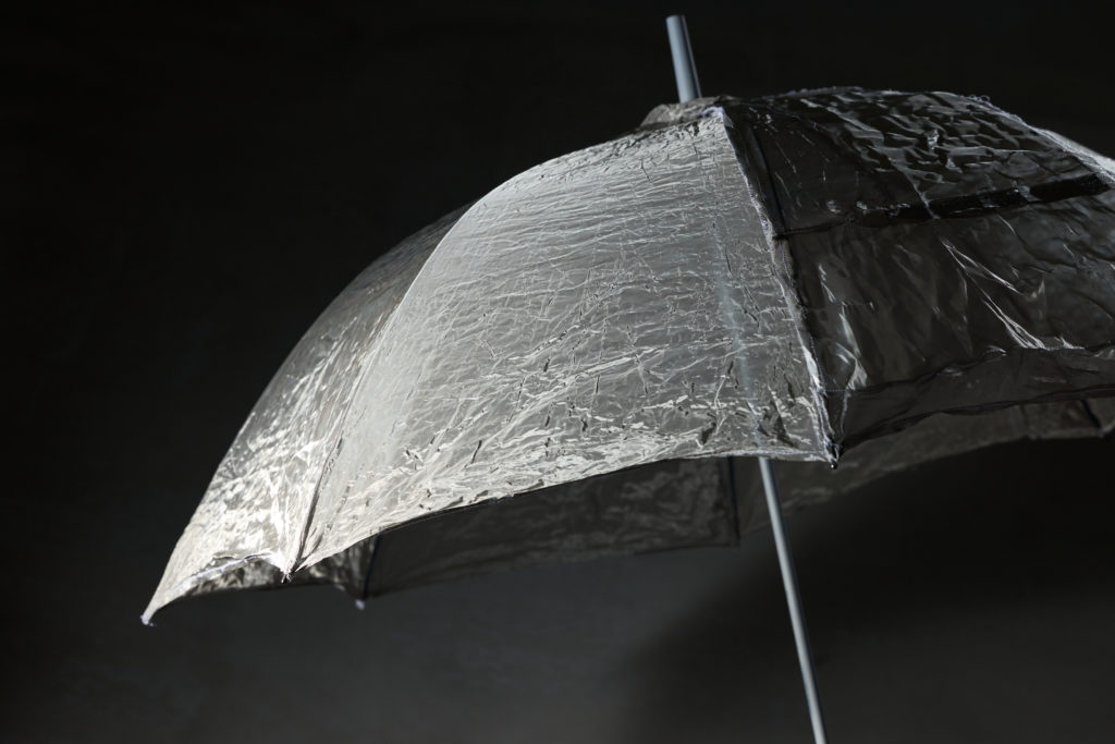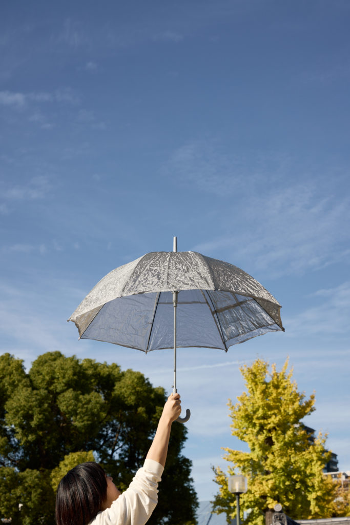 傘は雨の日に使うもの。日除けに使うもの。悪天候であったり自然から自分を防ぐために使うため出かけることが億劫になる。荷物にもなる。そんな感情の時に使用することが多い製品だが、喜びや楽しさを感じるものにできるのではないかと考えた。メッシュを通して景色を見た時、光や物の見え方がとても面白いと感じた。特に照明の光はメッシュを通して虹色のプリズムがたくさん発生してみえる。外では太陽に当たることでメッシュが多様な表情を持ち、傘が綺麗に見える。メッシュ素材で構成された傘を晴れた日にさしたり、室内で利用することで日常と違った景色を体験できるだろう。室内や晴れた日に傘をさして楽しむ人々がいる光景もまた面白い。楽しい、面白い景色を体験していただけたら嬉しい。