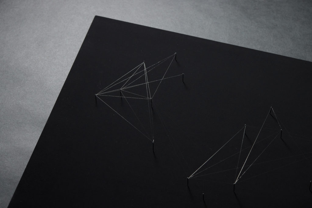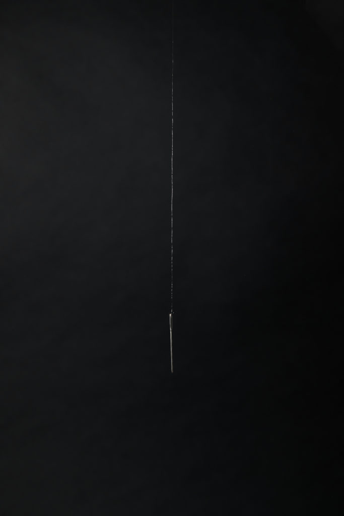 ライフワークと称して無対象な直線ばかり制作をしている。今回は、経糸を1本ずつを取り出し、快不快の赴くままに糸を張っていった。感覚に頼ることが「喜怒哀楽」を表現する方法だと思ったからだ。極細ゆえにほとんど見えない糸だが、角度を変えて眺めてみると、光を受けて現れる姿が美しかった。直線という造形の最小単位に近いものを扱っていると、いかに作品をコントロールしようとしても、見る角度によっては、全く別の姿になることがよく分かる。作品も作者を、鑑賞者をコントロールしようと振る舞うようだ。未知の素材を用いて直線と向き合う「喜・楽」から始めた制作だったが、繊細な素材はその制作過程においてむしろ、自らに「喜怒哀楽」を体験させるものだった。