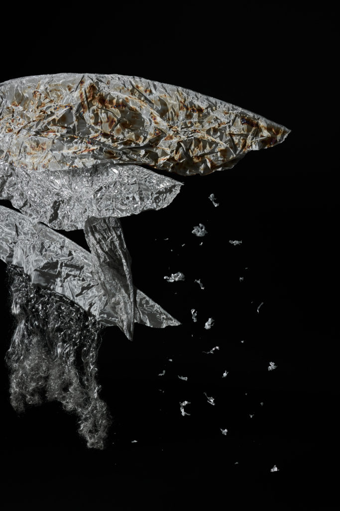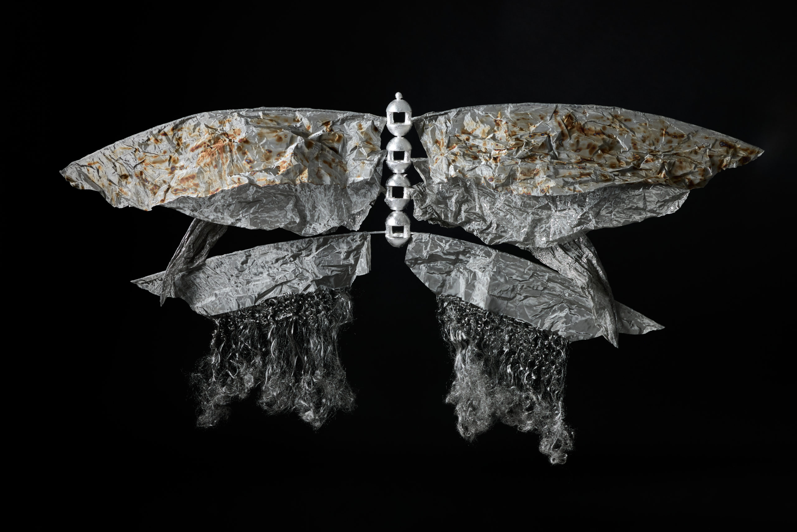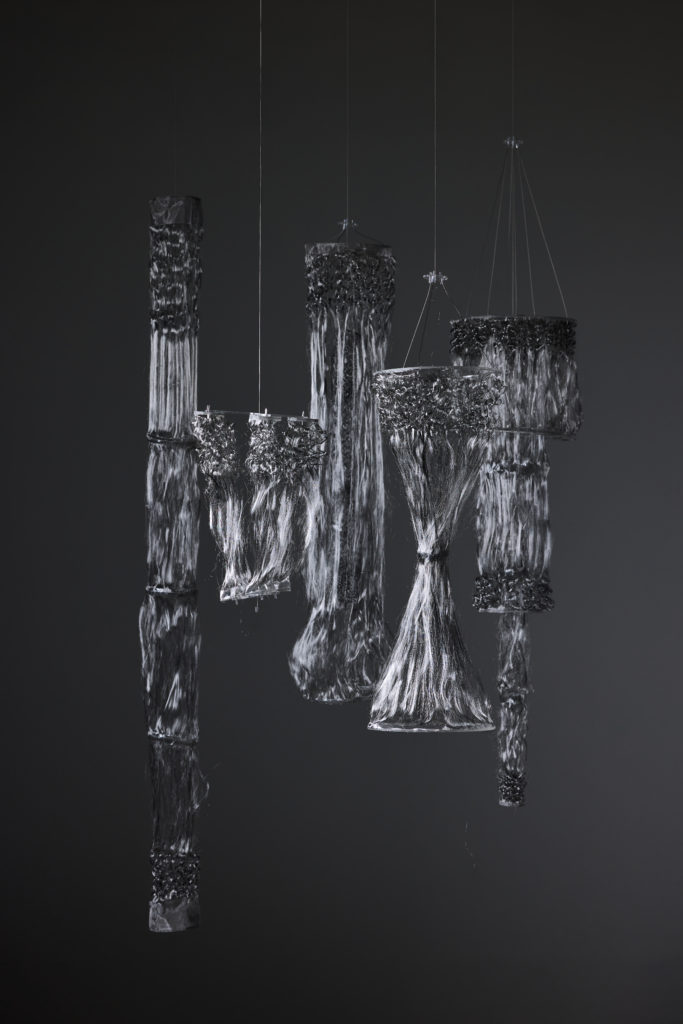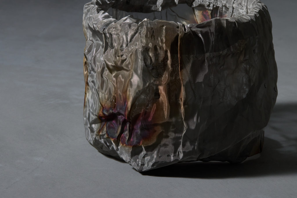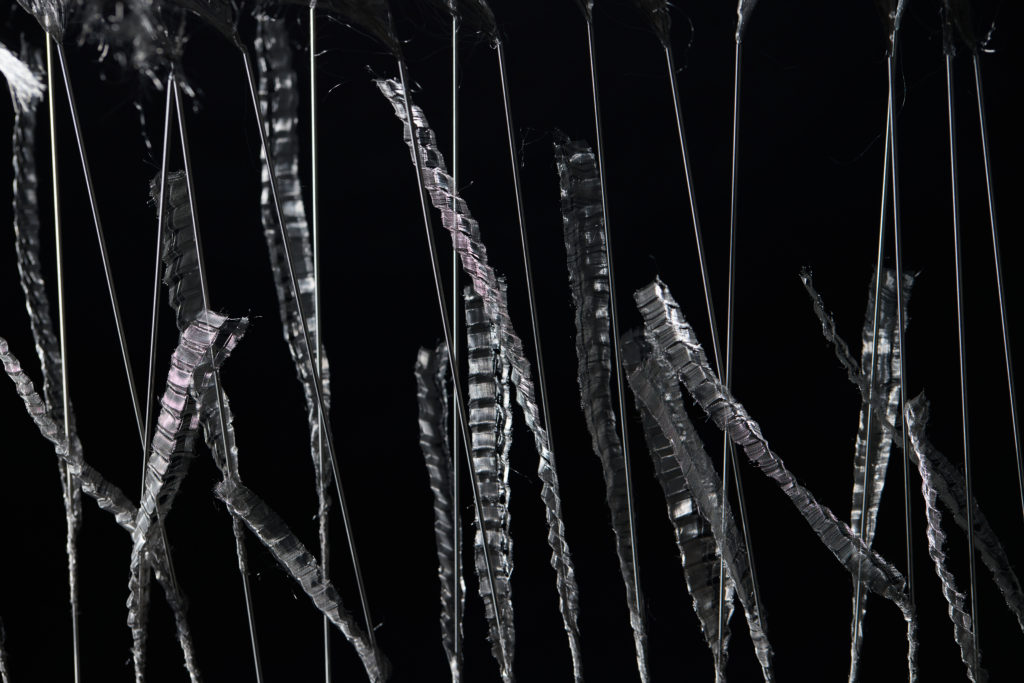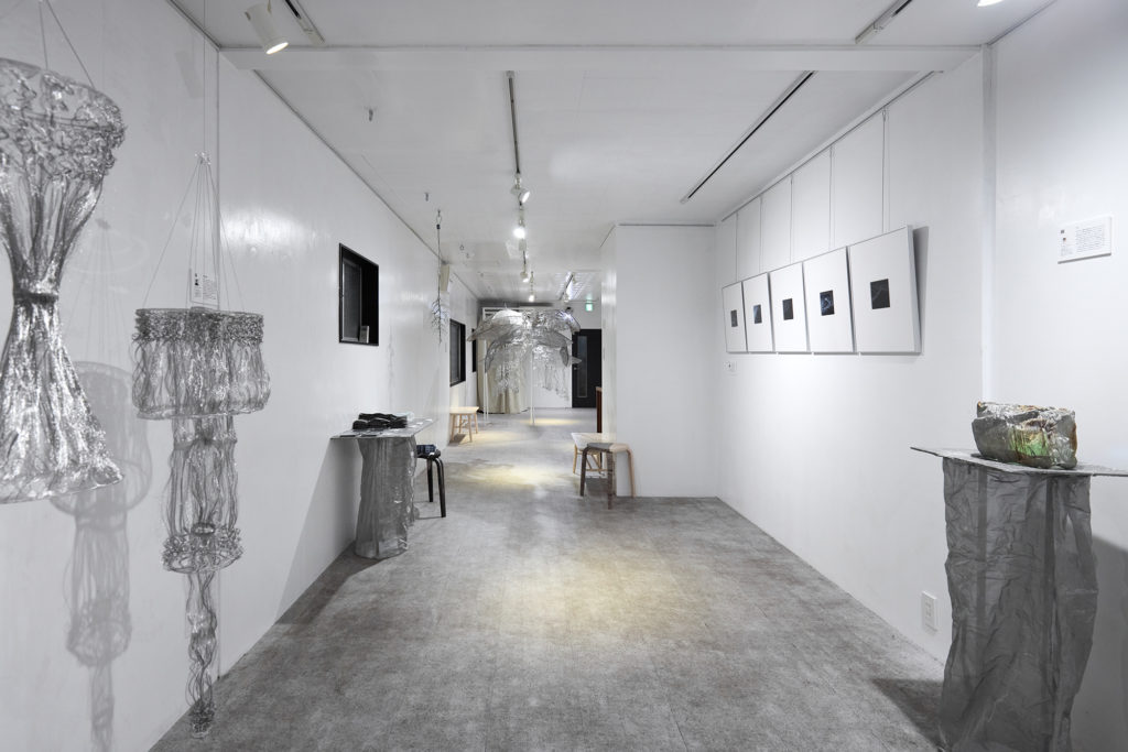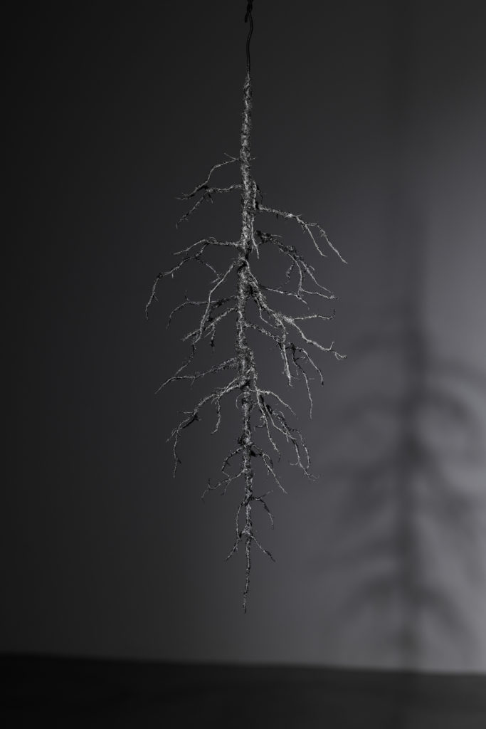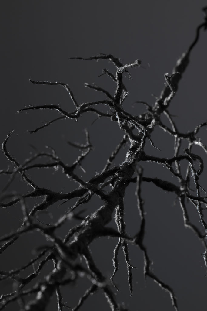 本来であれば廃棄されるはずだった金属織物の端材は、その巡り合わせから根源的なところに遡るような哀しさを秘めている。そうしたイメージで「根」のインスタレーション作品を制作した。根は植物を支える重要な役割を果たしているが、土の中にあるため私たちには見えない。今回扱う端材も同様に、普段私たちの目に触れることはないが、製品が生まれる過程において不可欠な存在であり、それはまさに「ルーツ」と言える。目には見えないけれど確かに存在する、様々な繋がりを意識してもらえるような作品を目指した。