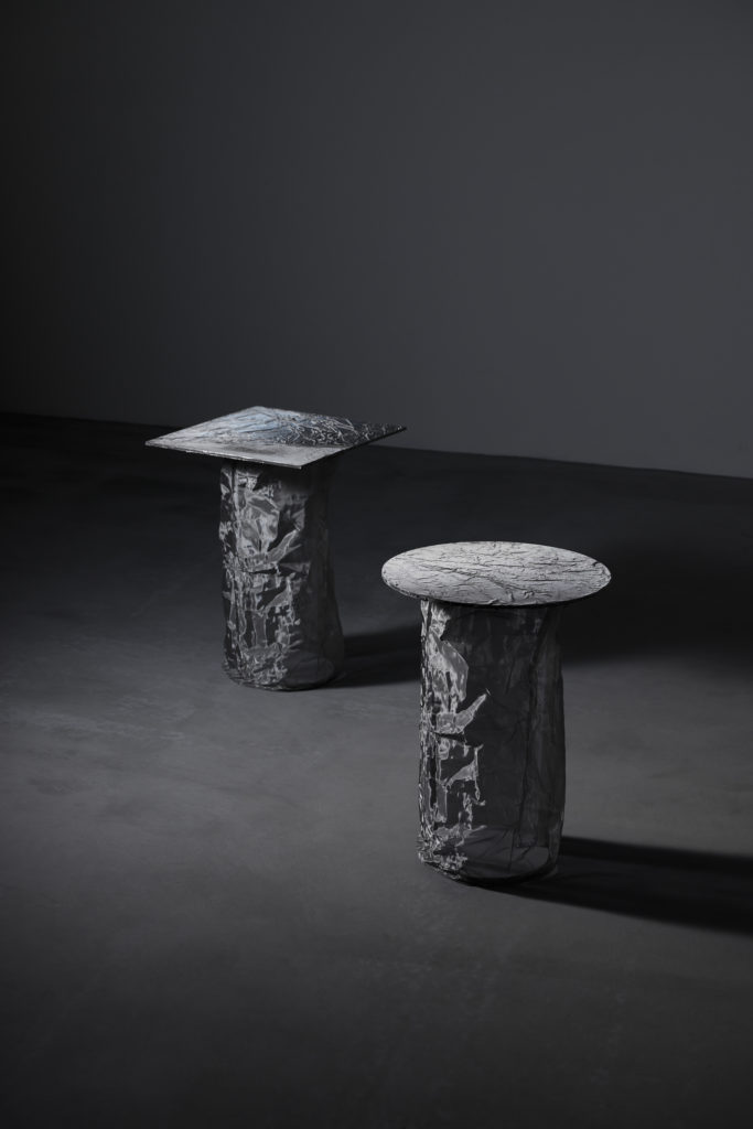 柱の形状は同じでそれが伸びたり縮んだり増えたりしながら、人との接点である天板の形のみが変わることで、都度変化する喜怒哀楽と変わらない自分という軸を表現。端材ならではのコントロールできない独特で複雑な表情は、均一化されていない唯一無二の個性を表現している。