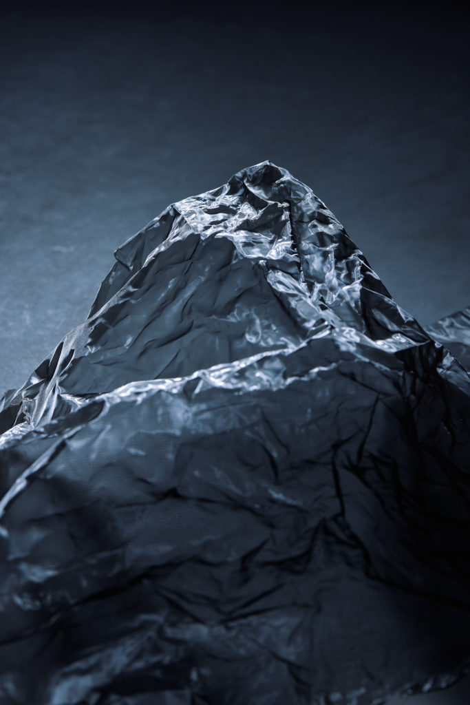 私のバックボーンには山がある。私の故郷は奥大和と呼ばれる深い山々のその更に奥地である。嬉しい時も哀しい時も顔を上げると山があった私は、都会に住む今も山を見ると心が躍り、衝動的にシャッターを切る。昔の人も山に対して様々な感情を抱いていたそうだ。神々が宿り、水が沸き、生命が息づく山は信仰の対象として人々に切にされてきたのである。21世紀においても人は信念に従い、時にバックボーンに影響されるが、私も例外ではない。メッシュが織りなす起伏から本能的に山々を連想し、織り地と光の角度で見え隠れする山のシルエットを探すことに没頭した。深夜のスタジオで山のスナップ写真が撮れる喜びは初めてのものだった。